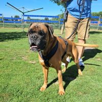 Der Rüde hat bisher in einem ruhigen Umfeld gelebt. Zu Artgenossen hatte er nur wenig Kontakt, verhält sich gegenüber diesen aber neutral. Atak hat eine gute Grunderziehung, er geht brav an der Leine, ist aufgeschlossen und lernwillig. Bisher wurde er überwiegend von seinem Frauchen geführt und betreut. Im Auto ist der Rüde gern dabei. Atak ist in einem top Zustand, er ist boxertypisch temperamentvoll, natürlich überall gern dabei, Krankheiten sind nicht bekannt, auch benötigt der Rüde keine Medikamente.