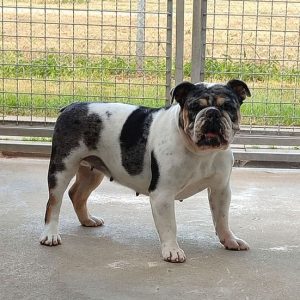 Bernie kam im Mai 2024 wegen Überforderung zu uns. Der American Bulldog Rüde ist ein wirklich netter Hund, aber er ist unglaublich kräftig – und seinen Kilos muss man in jeder Situation, auch bei Begegnungen mit Artgenossen, gewachsen sein.