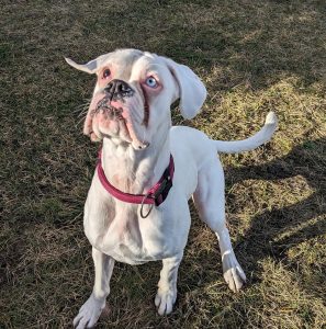 Sándor ist ein weißer, gehörloser Boxer, der im April 2023 geboren wurde.