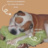 Mit seinen etwa 12 Jahren ist Bodo ein richtiger Senior, doch man sollte sich von seinem Alter nicht täuschen lassen: Er ist freundlich und aufgeschlossen, kann ein ganz schöner Sturkopf sein und sollte auch aufgrund seiner fast 50 Kilogramm nicht unterschätzt werden. Denn eine Sache, die der Opi gar nicht mag, sind andere Hunde. Eine Seniorenresidenz ganz für Bodo alleine, ohne andere Hunde, Haustiere oder kleine Kinder ist genau das Richtige für ihn. Am besten ist ein ruhiges, ebenerdiges Zuhause, gerne auf dem Land, bei Menschen mit Hundeerfahrung, die unserem Bodo den Lebensabend schenken, den er verdient.