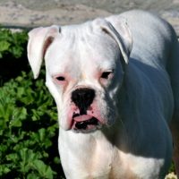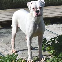 Bree ein kleines weißes Boxerkind sucht über uns ein neues Zuhause.