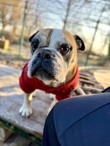 Skyla ist eine englische Bulldogge, die anfangs sehr unsicher ist, aber schnell auftaut.