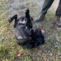 Beim Spaziergang schüttelt er anfangs oft den Kopf, wodurch etwas Sabber entsteht, der sich nach wenigen Minuten legt. Danach geht er ruhig an der Leine und lässt sich gut korrigieren, sodass er nicht mehr zieht.