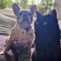 Die 12 kg leichte Hündin ist eine sogenannte Merle-Französische Bulldogge und bringt damit mehrere typische Qualzuchtmerkmale mit. Sie ist deutlich brachyzephal und zeigt in ihrem jungen Alter ausgeprägte Atemgeräusche. Zudem besteht eine bislang nicht abgeklärte Allergie. Auch eine chronische Patella-Problematik ist bekannt, die aktuell keine größeren Einschränkungen verursacht, langfristig jedoch berücksichtigt werden sollte. Wir suchen daher Menschen, die sich dieser gesundheitlichen Besonderheiten bewusst sind und bereit sind, Emma entsprechend verantwortungsvoll medizinisch zu begleiten.