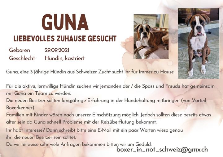 Die aktive lernwillige Hündin sucht boxererfahrene Menschen die Spaß und Freude daran haben mit Guna ein Team zu werden.