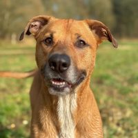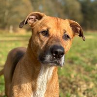 Der 60 cm große und 30 kg schwere Mischlingsrüde ist sensibel, verschmust und sehr an seiner Bezugsperson orientiert. Den Kontakt zu Kindern kennt er ebenfalls und zeigt sich mit diesen gut verträglich. Fremden Personen begegnet er anfangs eher unsicher, nach kurzer Zeit taut er jedoch auf, sucht Kontakt und lässt Nähe zu.