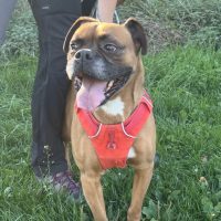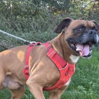 Er ist ein boxertypisch verspielter Hund, der noch einiges Lernen muss.