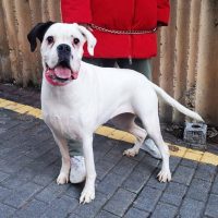 Maya ist eine wunderschöne weiße Boxerhündin mit einem außergewöhnlich lieben und fröhlichen Charakter.