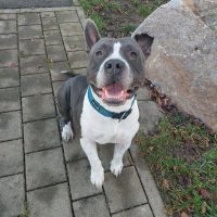 Der Pitbull-Mix kam wegen einem familiären Notfall als Abgabetier ins Tierheim zu uns.
