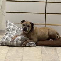 Yaman sucht ein neues, liebevolles Zuhause. Er lebt seit 2016 in seiner Familie, kam im Welpenalter zu ihnen und ist ein kastrierter Mischling aus Dogo Canario und American Staffordshire Terrier.