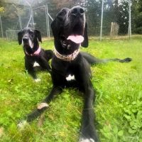 Zoe, eine sanfte siebenjährige Dogge, und ihre vierjährige Tochter Peaches schauen jedem Besucher still entgegen. Die beiden sanften Riesen mussten ihr bisheriges Zuhause verlassen. Ihr Mensch wurde krank – und konnte sich nicht mehr kümmern.